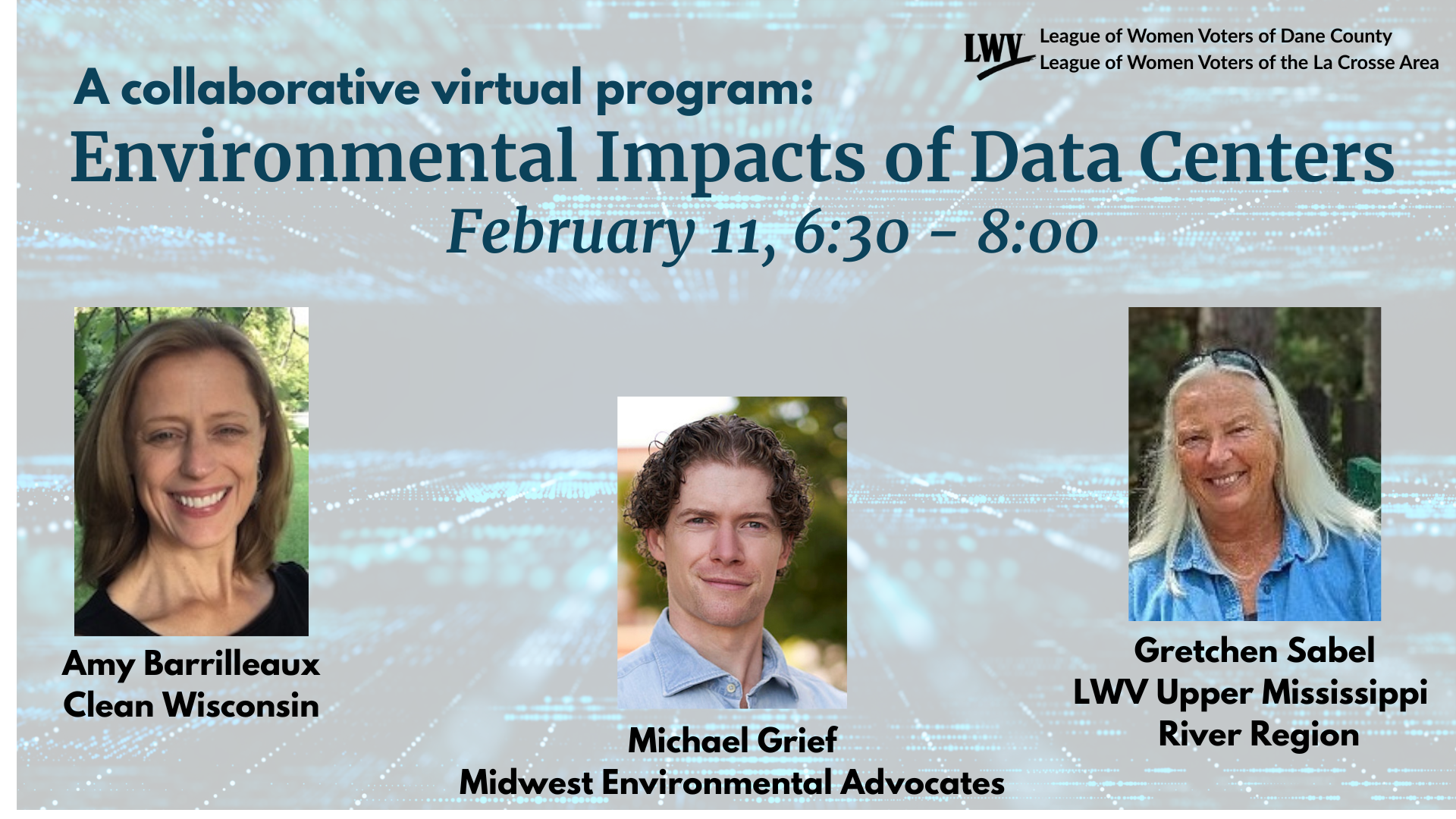 A lot has been promised, though a lot is obscure. The potential for destructive impact is troubling. It’s up to us to be informed and exercise the citizenry’s right to know. On 11 February 2026 at 6:30pm the La Crosse Area and Dane County Chapters of the League of Women Voters will host an all-state forum on Wisconsin Data Centers. This program will address the environmental impacts and concerns of data centers, including non-renewable electrical generation and increased demand, impact on local water supplies, noise and light pollution, and ecological degradation, as well as discuss the approval process for data centers and highlight opportunities for public discourse. We hope your Chapter and your community will join us!!