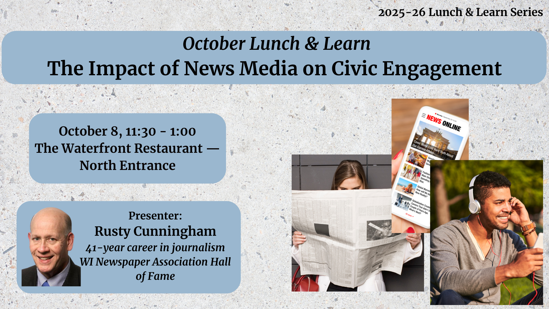 Please join us for this Lunch and Learn webinar. Our topic is “The Impact of News Media on Civic Engagement”. To reserve lunch, register by end of day Thursday, Oct. 2 at lwvlacrosse.org/program. Lunch is $20, or you can attend the program only for free at 12:00 p.m. A recording of the program will be posted on our website soon after the live event. Pre-paid lunches are nonrefundable. If you have any questions, please contact us at lwvlawi@gmail.com.
