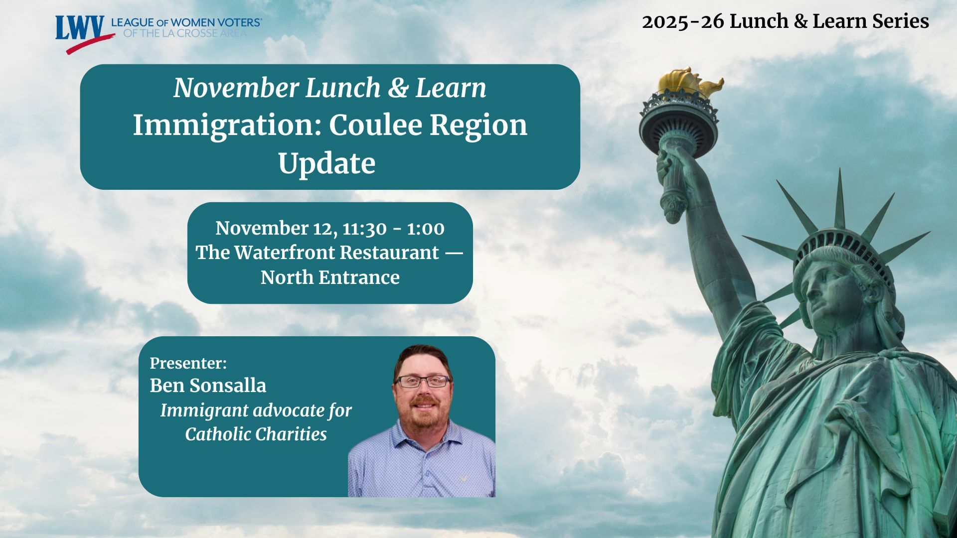 You're invited! Our topic this month is “Immigration: Coulee Region Update.” To reserve lunch, register by end of day Wednesday, Nov. 5th at lwvlacrosse.org/program. Lunch is $20, or you can attend the program only for free at 12:00 p.m. A recording of the program will be posted on our website soon after the live event. Pre-paid lunches are nonrefundable. If you have any questions, please contact us at lwvlawi@gmail.com.