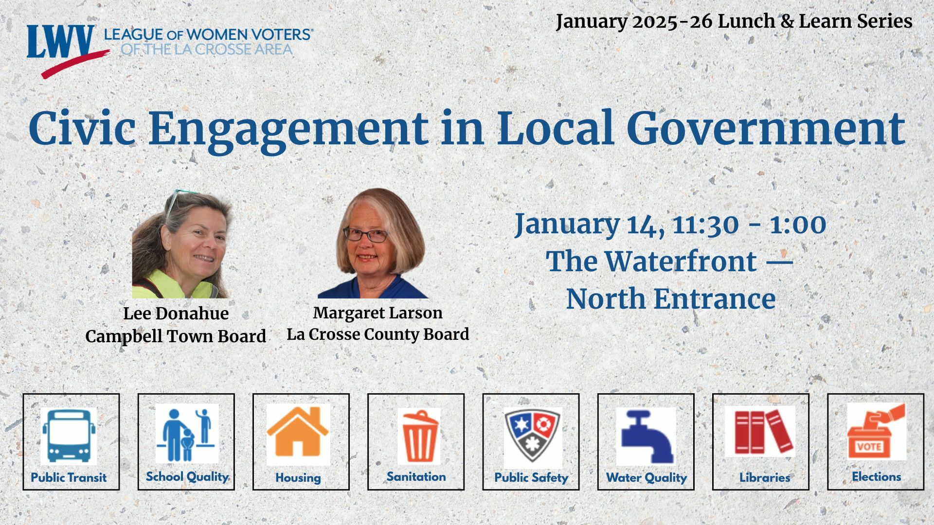 Program Information: Our government starts right here with our neighbors and communities. Two of our very own League members who play a key role in local government, Lee Donahue, a Town of Campbell Supervisor, and Margaret Larson, a La Crosse County Supervisor, will be speaking about civic engagement at the local level. They will address some of the critical issues facing our community now. We hope you can attend!